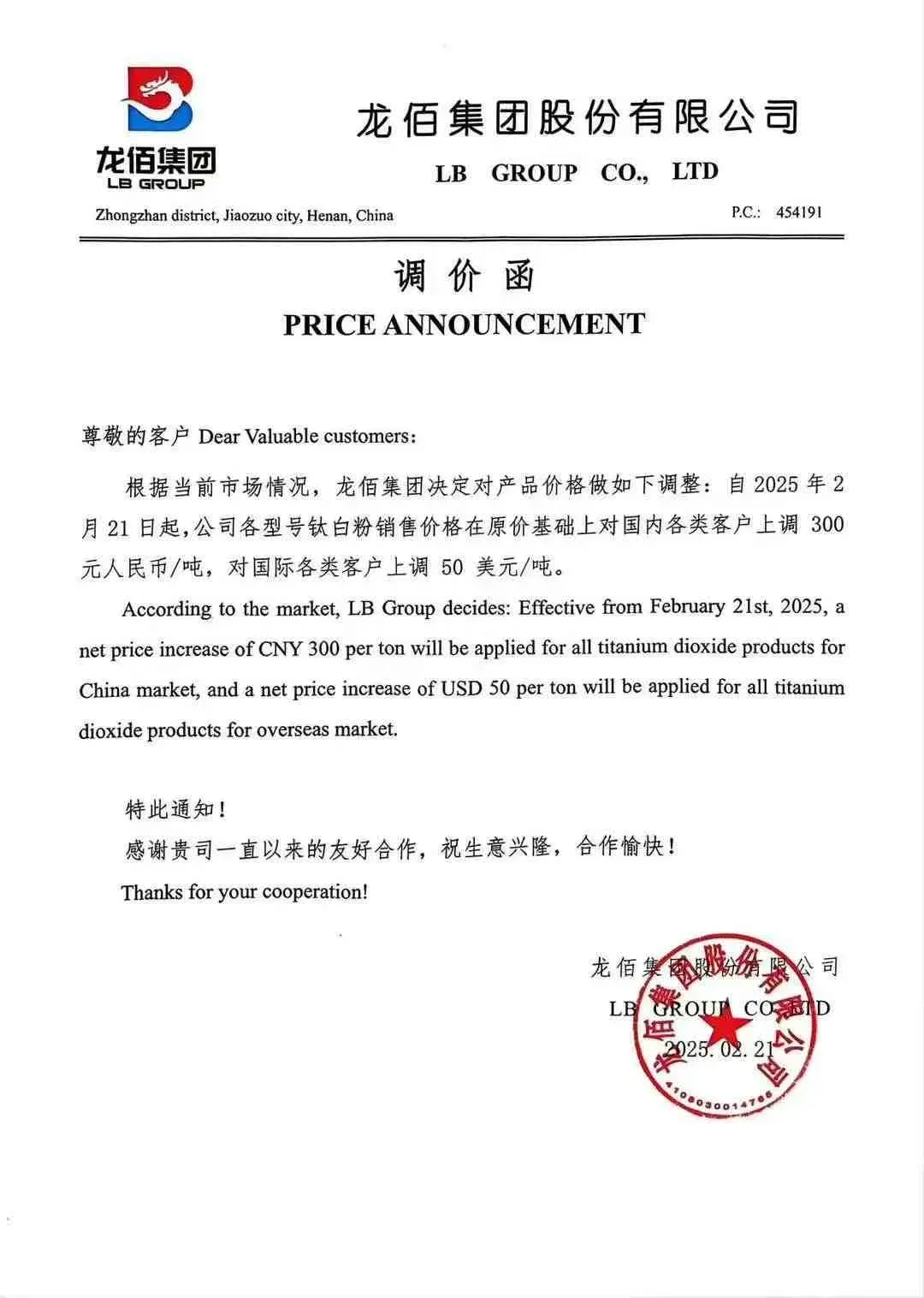 除此之外,近期,鈦白粉市場風(fēng)云變幻,以龍佰集團(tuán)、安納達(dá)等為代表的20多家國內(nèi)外鈦白粉企業(yè)相繼上調(diào)價格,已連漲三輪。今年內(nèi)國內(nèi)市場累計上調(diào)最高1100元/噸,海外最高累計調(diào)漲150美元/噸,海外巨頭科慕也宣布了第二季度的漲價計劃。