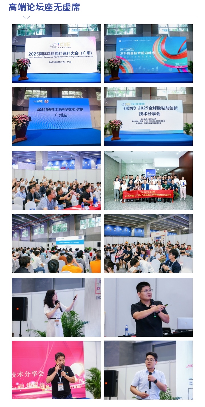 展會期間舉辦了2025國際涂料原料選料大會、涂料狼群技術沙龍、2025年涂料抗菌技術前沿峰會暨創新應用案例發布會、《膠界》2025全球膠粘劑創新技術分享會、2025中國(廣州)汽車表面工程暨防腐蝕技術研討會、2025年全國表面處理技術創新領航應用案例暨科技創新論壇、2025中國表面工程行業優質供應商頒獎典禮、2025金屬表面處理高質量發展研討會、表面工程領域園區運營與環保論壇、表面工程技術高質量發展論壇和新產品、新技術、新工藝推廣會。組委會傾力打造多場高端論壇、技術峰會及產業對接會,匯聚全球頂尖專家、行業領袖及創新企業,通過前沿技術分享、戰略對話與深度合作,搭建起推動產業升級、引領技術變革的高端平臺,全方位賦能涂料油墨膠粘劑行業高質量發展。