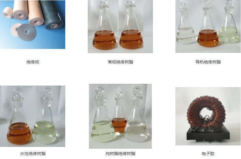 公司生產的(B級、F級、H級、200級、220級及240級)絕緣樹脂、電子膠、云母帶及其它柔軟復合材料,廣泛適用于各種電機、電器的絕緣處理;特種涂料廣泛應用于車輛燈具防霧處理等領域。